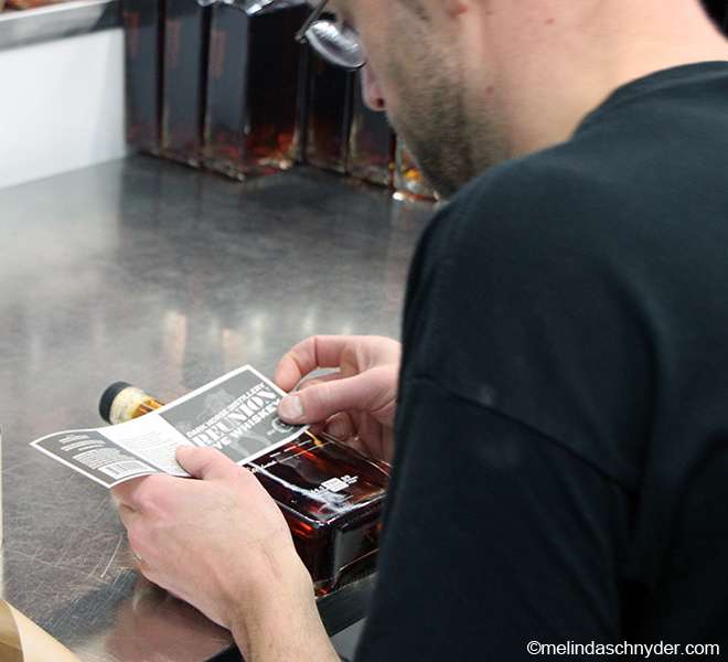 <photo> Hand labeling bottles of Reunion rye whiskey at Dark Horse Distillery.